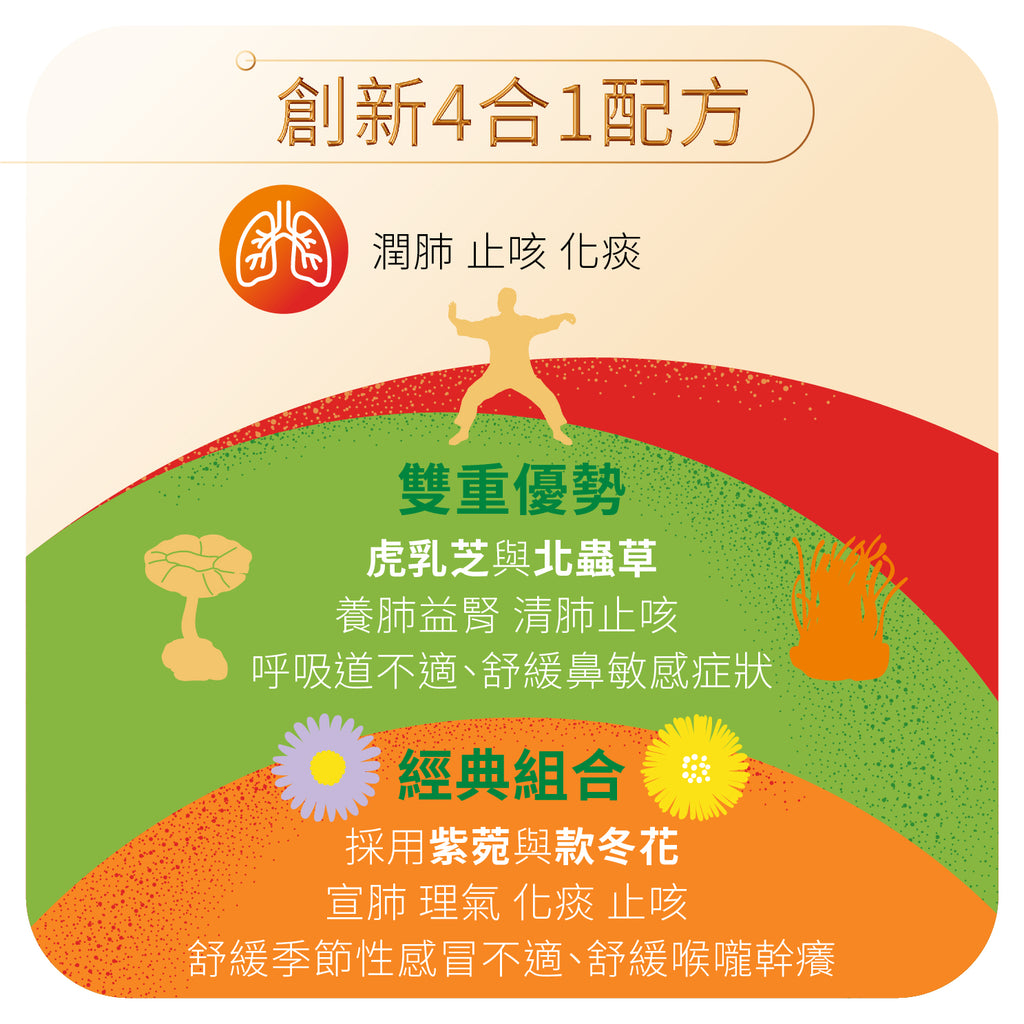TCM-Inspired Respiratory Support Features the classic herbal pairing of Aster and Coltsfoot, enhanced with Tiger Milk Mushroom (LIGNO® TM02) and greenhouse Cordyceps.