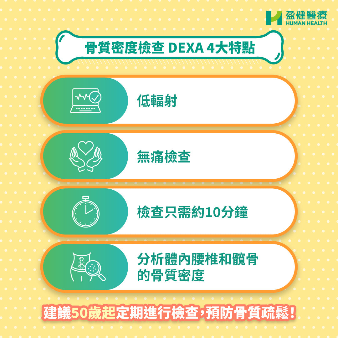 骨質密度檢查,又稱為DEXA/DXA,是現今最普遍測量骨質密度的方法。利用兩種不同能量X光,分析體內腰椎和髖骨的骨質密度,以檢測體內骨質流失情況。檢查所需輻射劑量十分低,約為平面X-光肺片的十分之一。整個過程安全、快速無痛,檢查只需約10分鐘即可完成。
